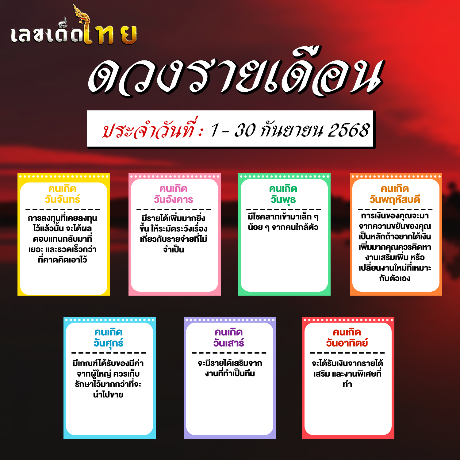 ดวงรายเดือนกันยายน 2568 ประจำวันเกิดทั้ง 7 วัน