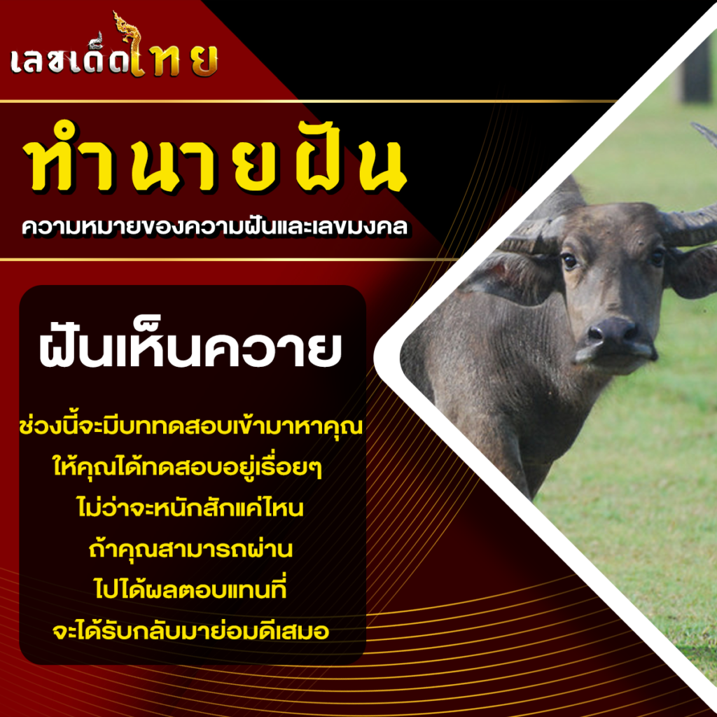 คำทำนายฝัน ฝันว่าเห็นควาย: ช่วงนี้จะมีบททดสอบเข้ามาหาคุณให้คุณได้ทดสอบอยู่เรื่อยๆ ไม่ว่าจะหนักสักแค่ไหนถ้าคุณสามารถผ่านไปได้ผลตอบแทนที่จะได้รับกลับมาย่อมดีเสมอ