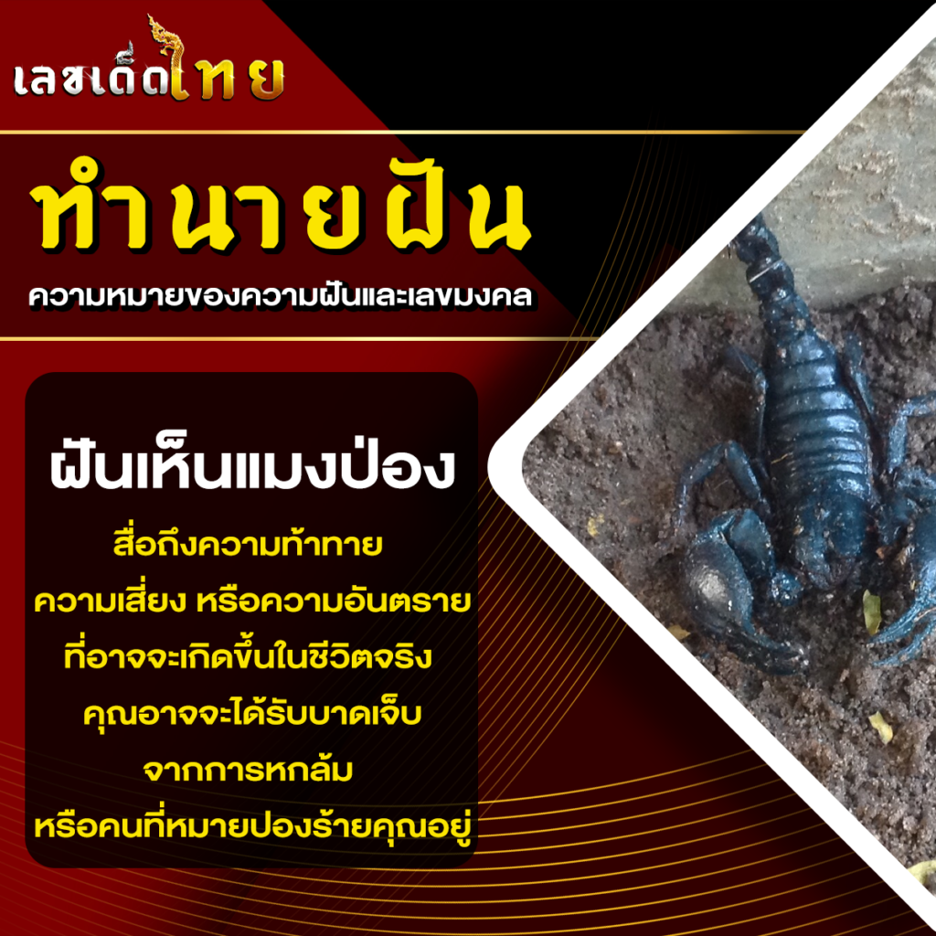 คำทำนายฝัน ฝันว่าเห็นแมงป่อง: สื่อถึงความท้าทาย ความเสี่ยง หรือความอันตรายที่อาจจะเกิดขึ้นในชีวิตจริง คุณอาจจะได้รับบาดเจ็บจากการหกล้ม หรือคนที่หมายปองร้ายคุณอยู่ คุณต้องระมัดระวังในสถานการณ์บางอย่างที่จะเกิดขึ้นกับคุณ